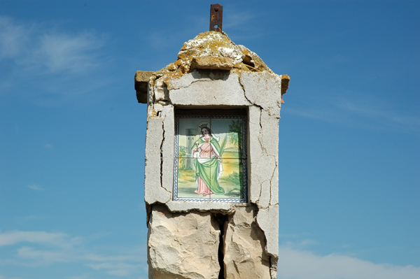 La figura se encuentra en una hornacina rectangular poco profunda. Está realizada en cerámica policromada, compuesta por cuatro pequeños baldosines.