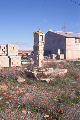 El fuste está realizado en mampostería, trabajada en bloques paralelepipédicos más o menos regulares, y se encontraba recubierto de un revoque de yeso, que en la actualidad se conserva únicamente en la parte superior del pilar y en uno de sus laterales.